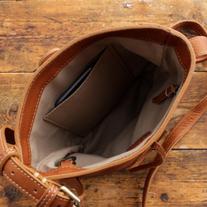 内布はコットン、スマホが入るサイズのポケットが1箇所。ジッパーポケットが1箇所。