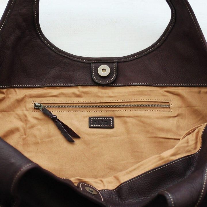 革の切り替えを少なく、留め具マグネット以外の金具を使ってないプレーンなバッグは、シンプルで存在感のある一品。