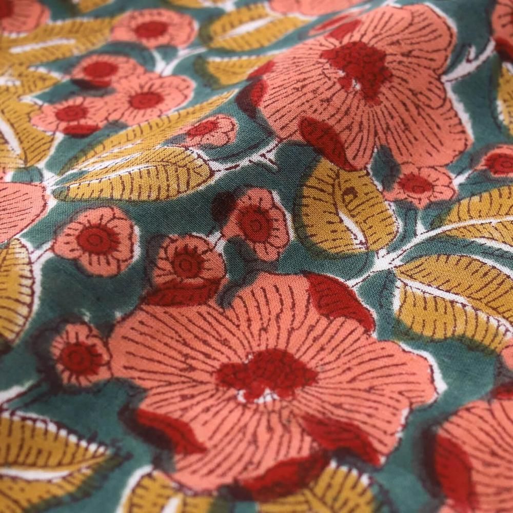 色ごとに木版を作り、それらを重ねてスタンプして、一枚の布を仕上げていく、インドの伝統の染色技法です。 デザインを木に彫り起こすところからプリント完成まで、機械を使わず全て人の手によって行われるのが特徴。 寸分の狂いのないよう木版を彫る職人、継ぎ目がわからないよう隙間なく版を押し、複数の色を正確に重ねていく職人。