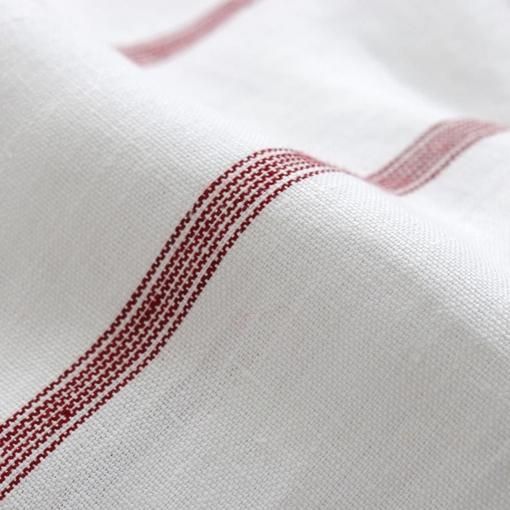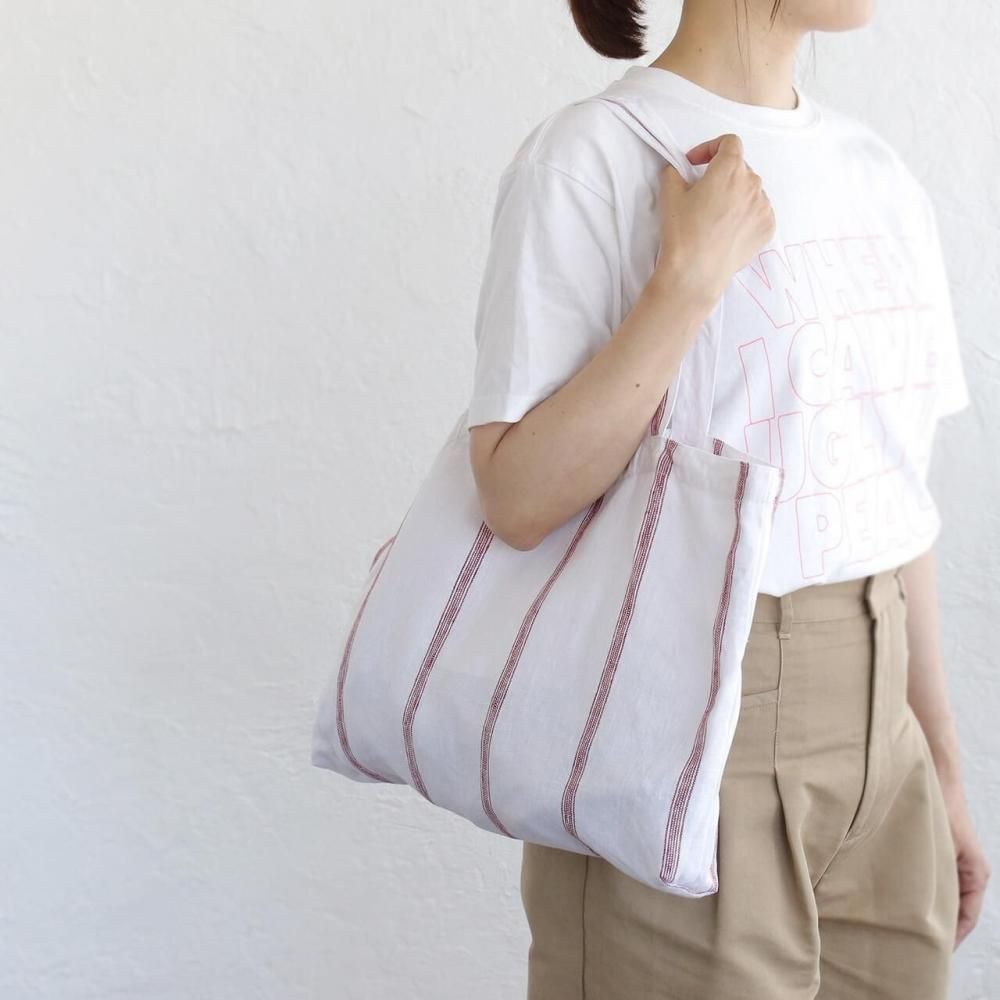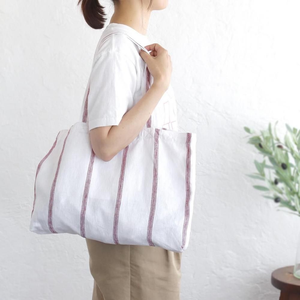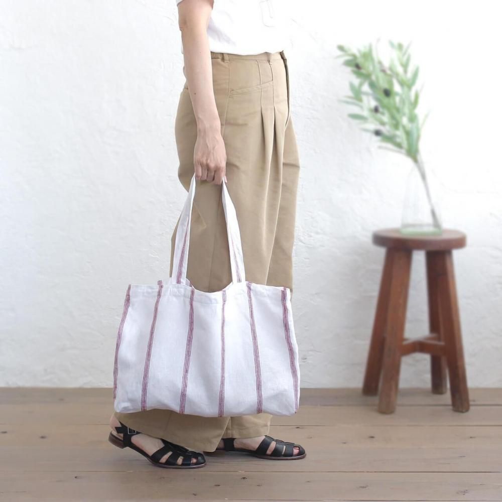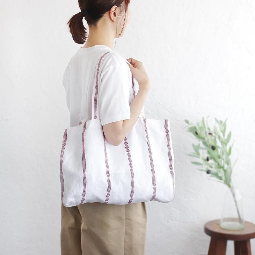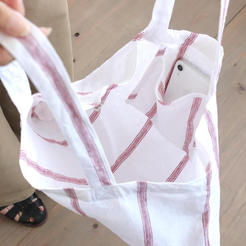 白地に細かな赤いストライプが映える、リネン素材の軽やかなトートバッグ。