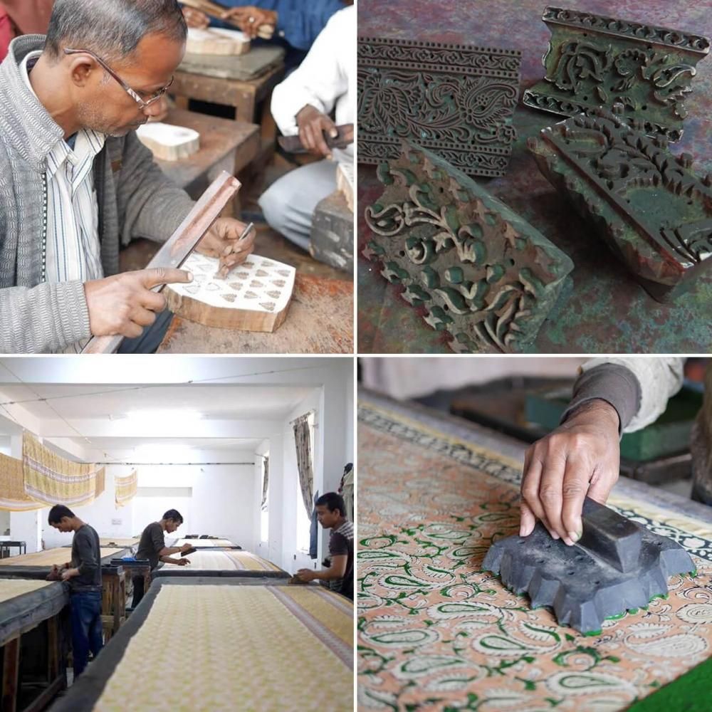 色ごとに木版を作り、それらを重ねてスタンプして、一枚の布を仕上げていく、インドの伝統の染色技法です。 デザインを木に彫り起こすところからプリント完成まで、機械を使わず全て人の手によって行われるのが特徴。 寸分の狂いのないよう木版を彫る職人、継ぎ目がわからないよう隙間なく版を押し、複数の色を正確に重ねていく職人。